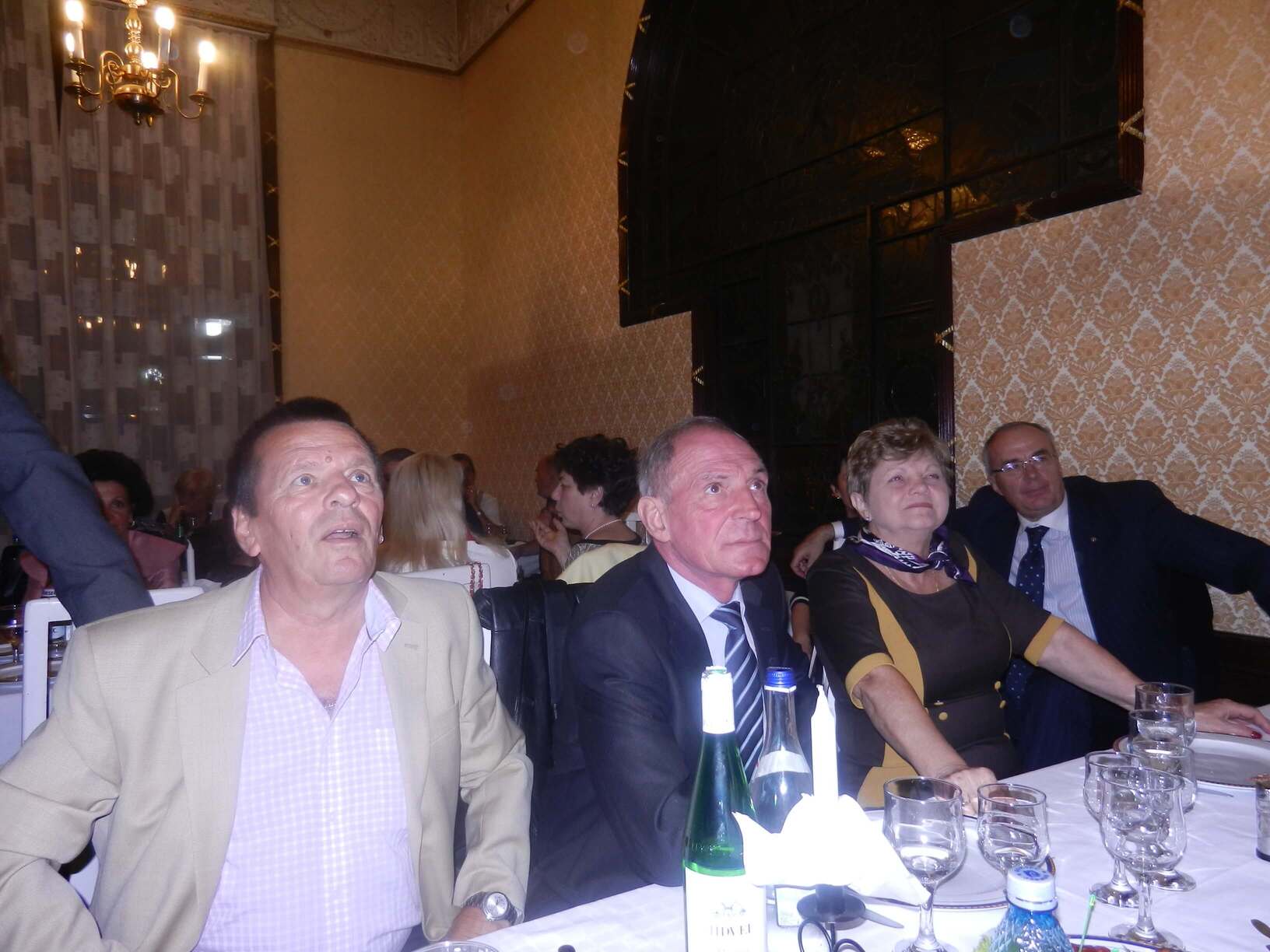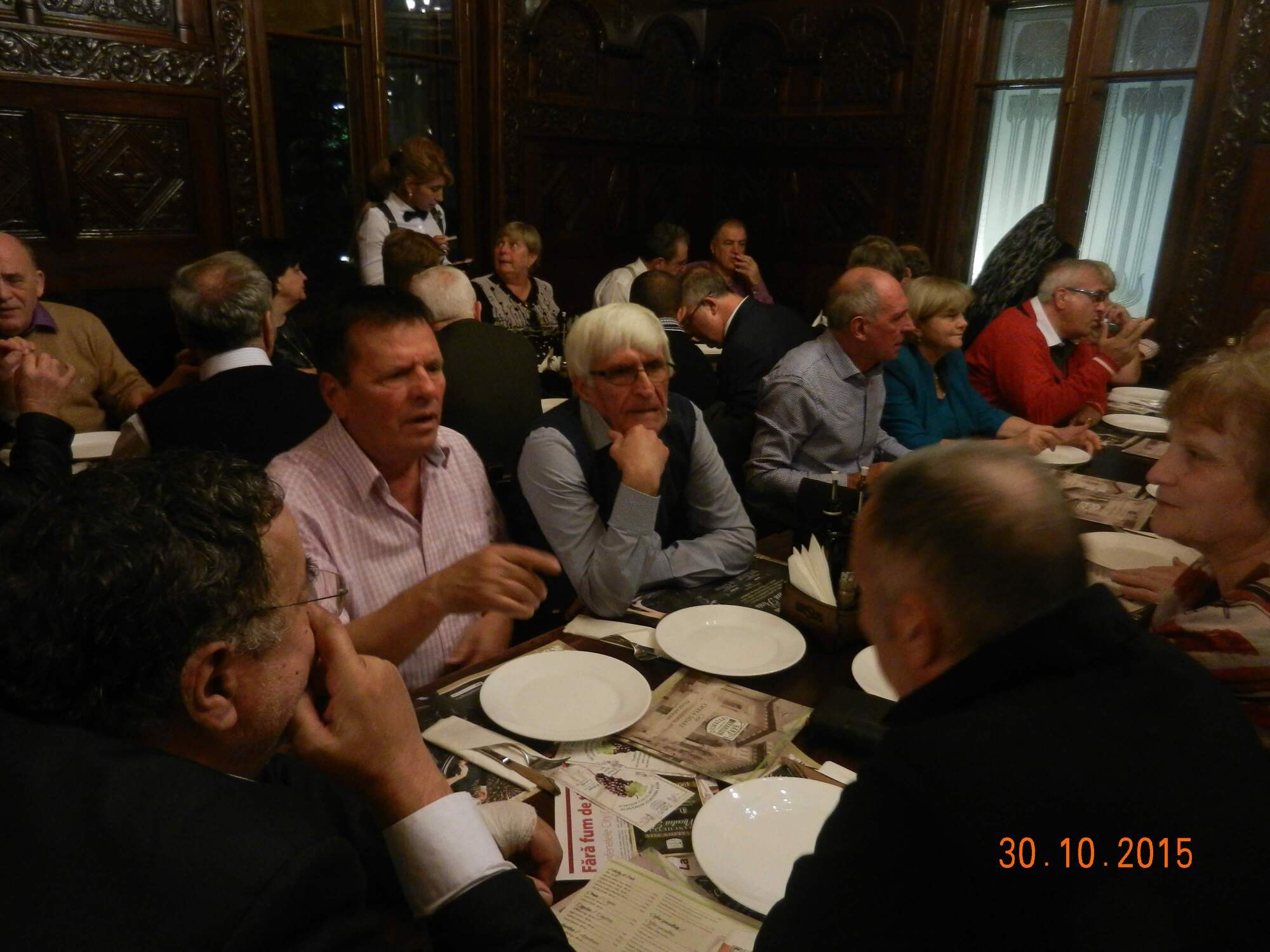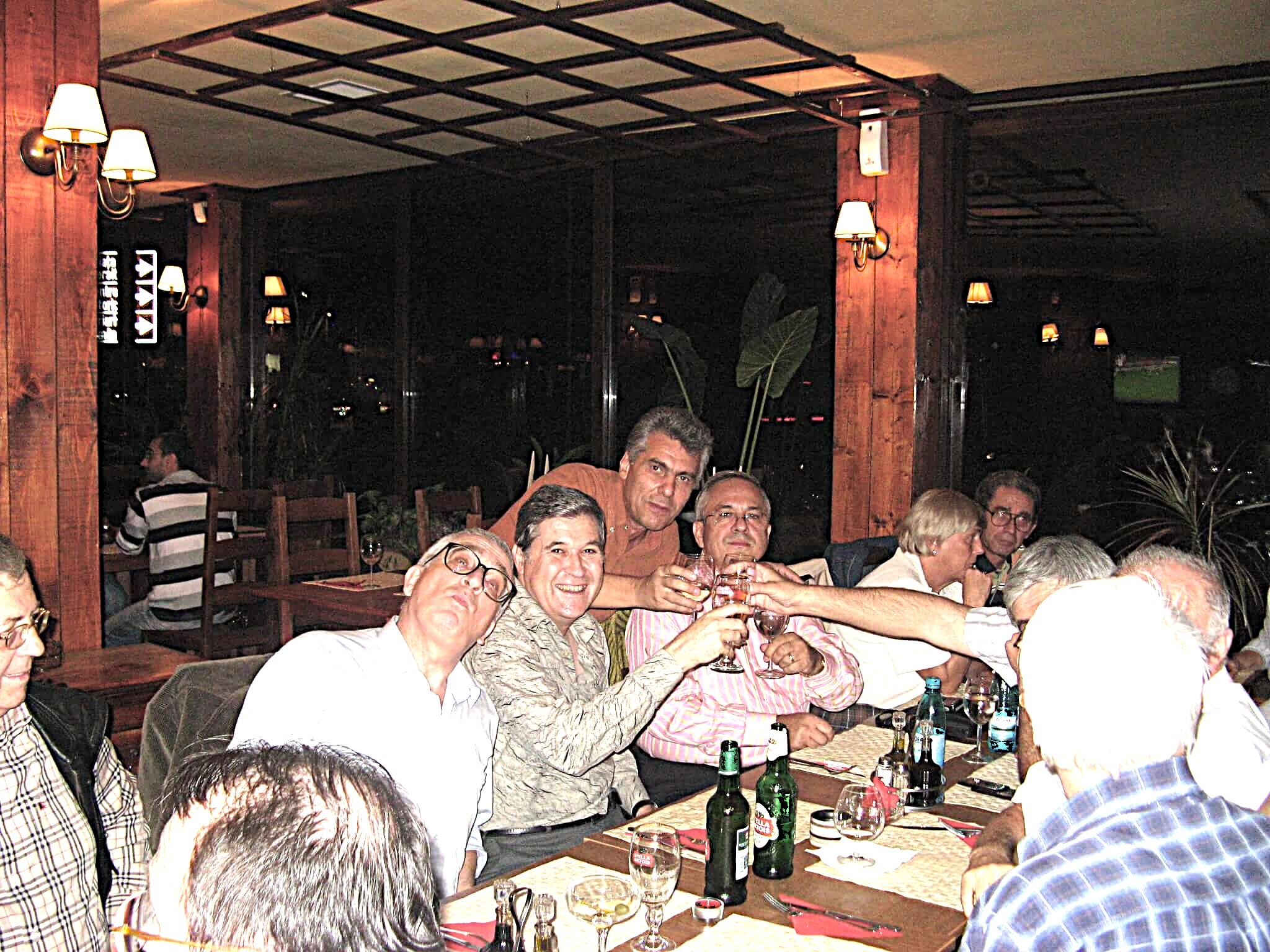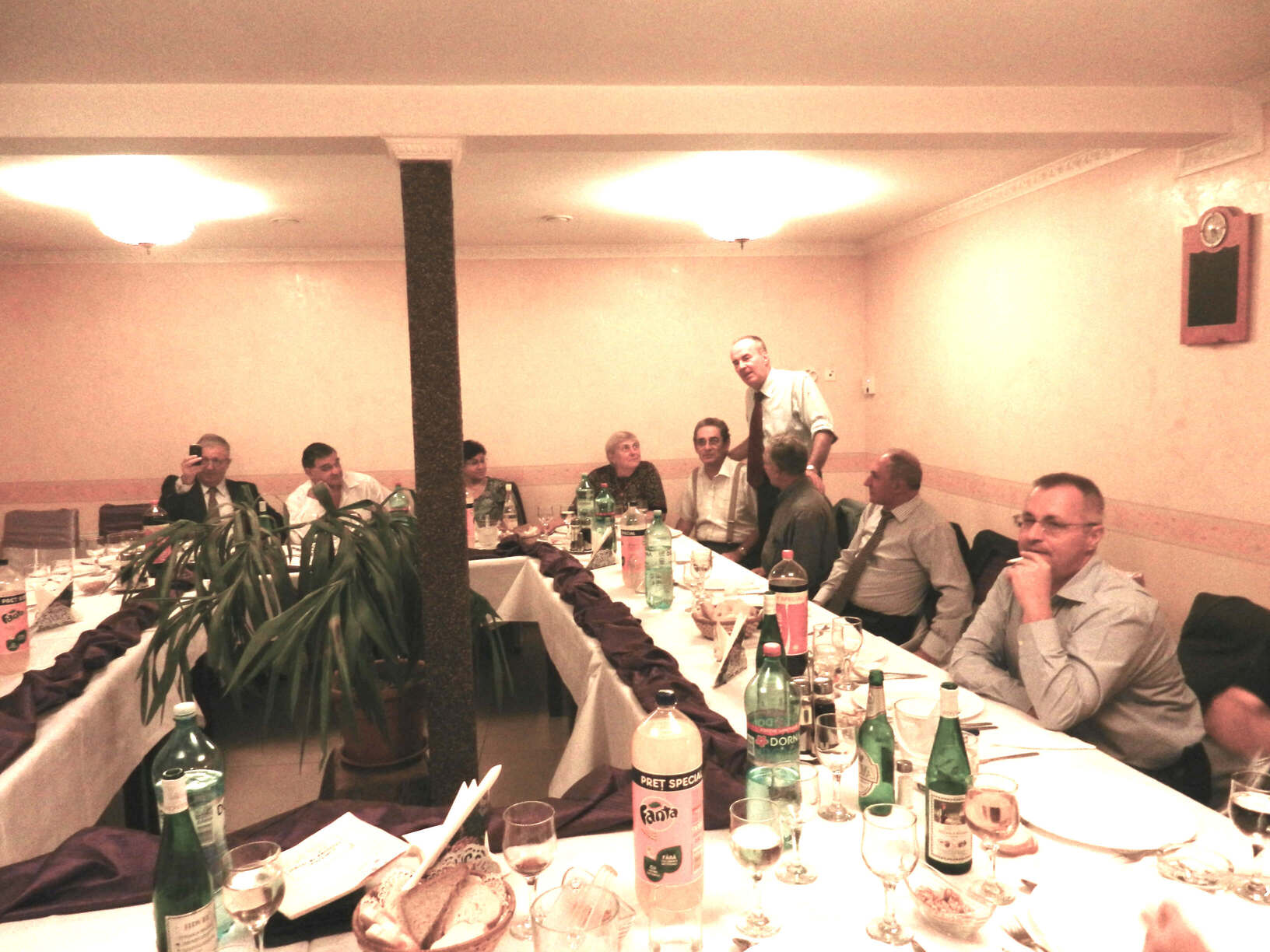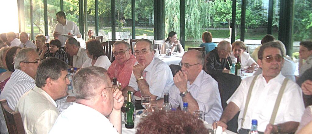 Participare numeroasă. Probabil ca urmare a timpului mai lung de la ultima întâlnire sau a mobilizării eficiente. Sala de la restaurant a fost cam mică și am stat cam înghesuiți. Pe parcurs ne-am adaptat. Am fost cu toți mobili și au fost create spații. Cântece de petrecere din vremuri de demult. Echipa grea cu Tache, eternul Tache, prim solist, Gică Iorga solist, armonie percuție, clape și ce mai e nevoie, Barbu Mihai și Gheorghiu din partea producătorului, Dopan Silviu de la finanțator (se observă evident în imagini) și Bulache Ungureanu, regizorul, care o cam luase pe ulei. Doxan Gabriel, Gigi Diaciuc, Ilie Pravă, Tuță Marin (termina ce mai avea de mâncat ) și Am trecut la amintiri și cântecele noastre. Au rămas băieții de cursă lungă. Cu puțină viteză luată de la vinul restaurantului și in special de la cel adus de noi am început să ne amintim de cântările pe care le făceam in vremea studenției. Tică Tache făcea eforturi de mobilizare la cântat. Cam greu cu noi.